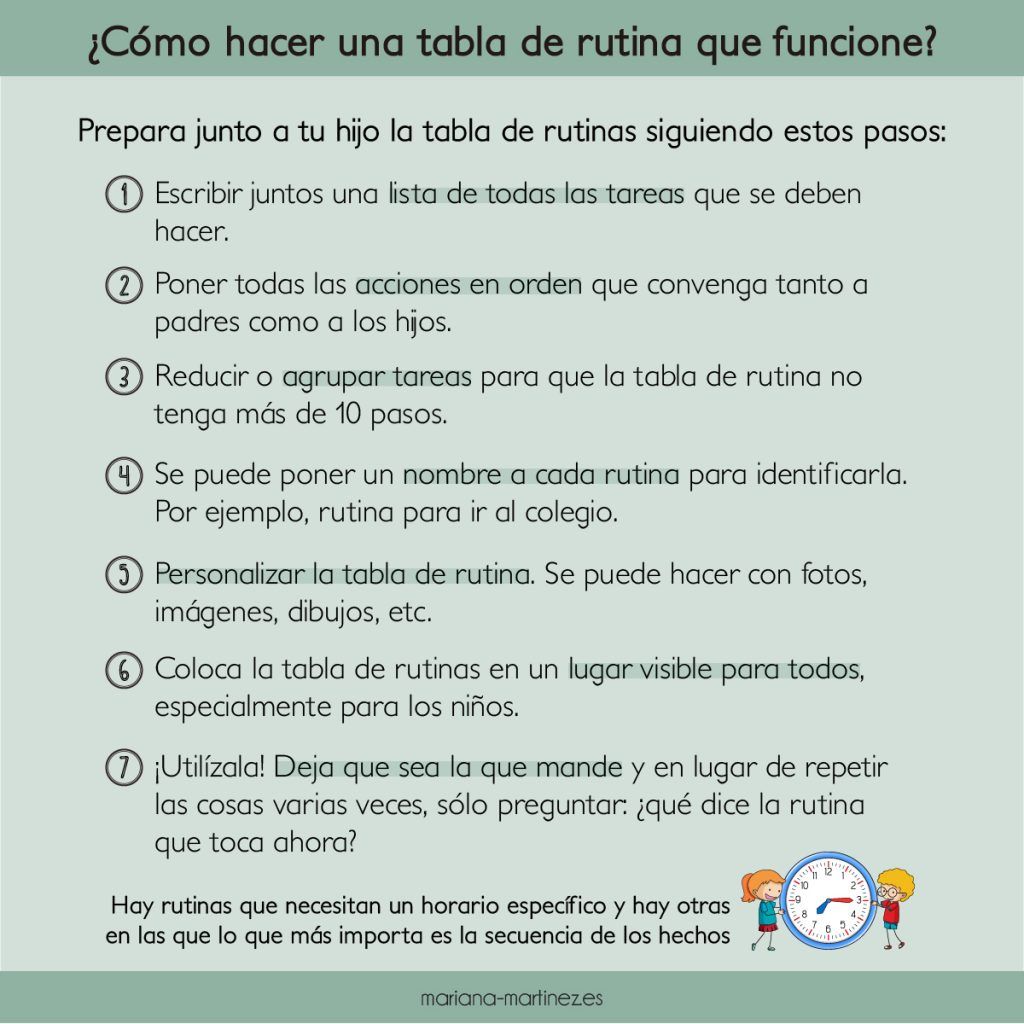 Para que una rutina funcione el mayor tiempo posible, es importante involucrar al niño o adolescente para que juntos decidan la lista de tareas o pasos que ésta debe incluir. Se puede preguntar, por ejemplo: ¿qué necesitas hacer antes de poder ir a la cama? Entonces se hace una lluvia de ideas con todas las acciones. Los padres pueden hacer alguna sugerencia como: ¿qué tal dejar preparada la ropa que te pondrás al día siguiente? El orden en el que se deben llevar a cabo los pasos también debe ser consensuado entre padres e hijos.